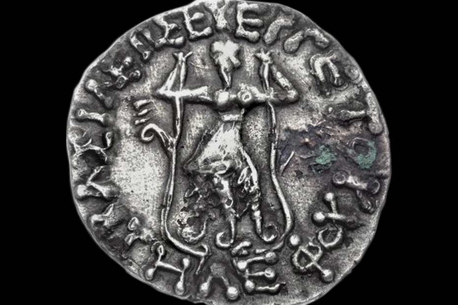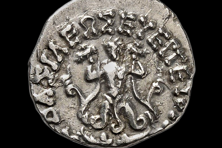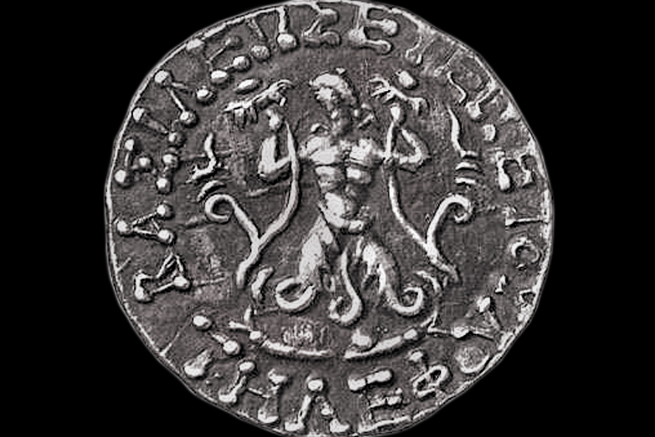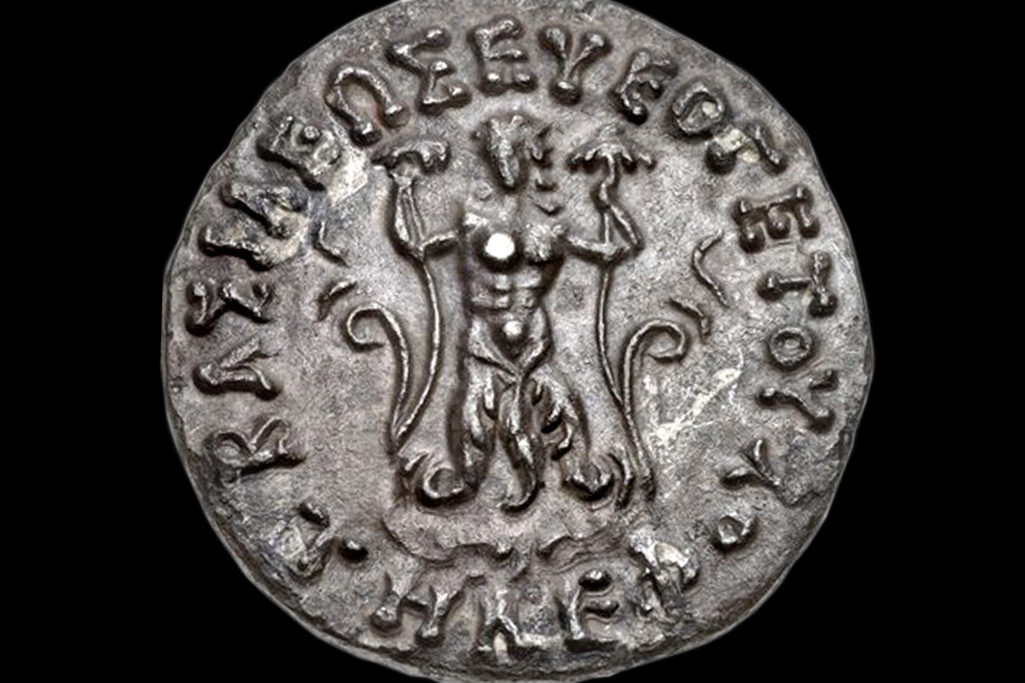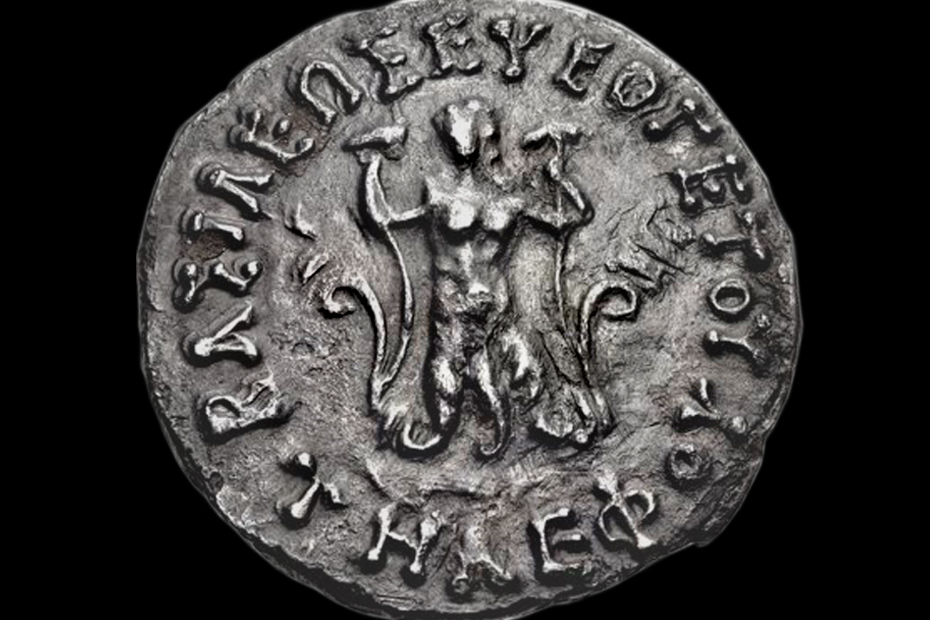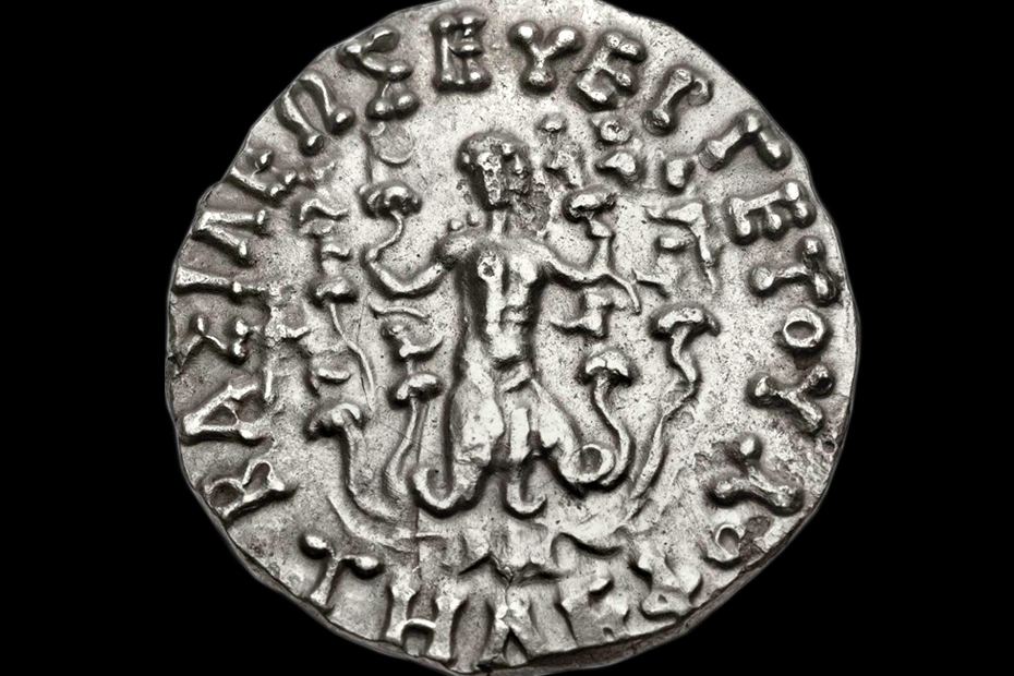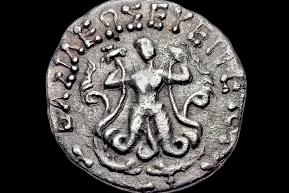 | Set III-2-gip-001. In Greco-Roman iconography, Phytopode Giant was a plant-legged composite creature. In the numismatic corpus, the Phytopode Giant is registered exclusively on the Greco-Bactrian coinage of the Hellenistic period. The relevant image-text concordances (e.g. narrative association with the sun-god Helios, moon-goddess Selene, and dawn-goddess Eos as well as with the mountains (rocks) and plant-generating Giant's blood) suggest the possible identification of the main subject as Alcyoneus or Picolous.